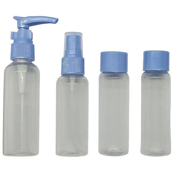El set contiene 5 piezas plásticas. Botellas con spray, dispensadora y tapa a rosca. Disponible en celeste y rosa.