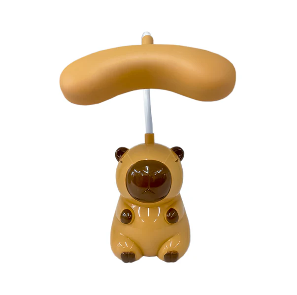 Lámpara LED con diseño de capibara. Cuenta con brazo flexible y sacapuntas. Recargable por medio de cable USB (incluido).